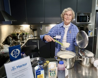 Ruokamarttamme Terttu Närhi tarjoilee puuroa Marttojen puuroillassa Myllypuron kirjastolla 14.10.2024.